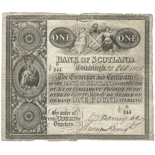 | Obverse lettering | Bank of Scotland Edinburgh The Governor and Company of the Bank of Scotland constituted by act of parliament promise to pay or bearer on demand at the here to George Sandy or bearer on demand ONE POUND Sterling By order of the Court of Directors |