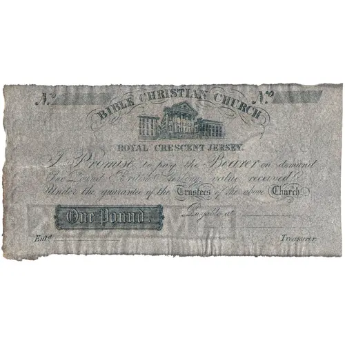 | 正面铭文 | BIBLE CHRISTIAN CHURCH ROYAL CRESCENT JERSEY I PROMISE TO PAY THE BEARER ON DEMAND ONE POUND BRITISH STERLING VALUE RECEIVED UNDER THE GUARANTEE OF THE TRUSTEES OF THE ABOVE CHURCH ONE POUND |