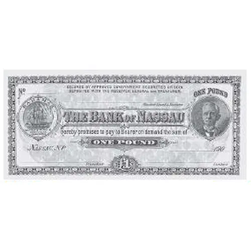 ONE POUND SECURED BY APPROVED GOVERNMENT SECURITIES OR COIN DEPOSITED WITH THE RECEIVER GENERAL & TREASURER THE BANK OF NASSAU HEREBY PROMISES TO PAY TO BEARER ON DEMAND THE SUM ONE POUND |