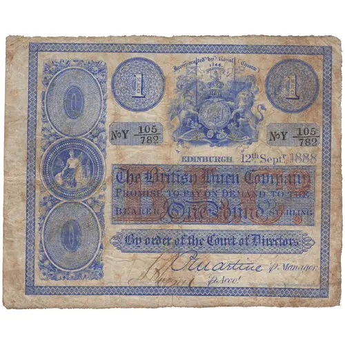 | Obverse lettering | Incorporated by Royal Charter 1746 The British Linen Company Promise to Pay on Demand to the Bearer One Pound Sterling By order of the Court of Directors |