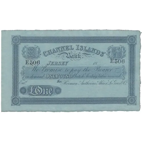 | Obverse lettering | CHANNEL ISLANDS Bank. JERSEY_ 18_ We Promise to pay the Bearer on Demand ONE POUND British Sterling Value received. Ent.d_ For Horman, Anthoine, Athier, LeGros & Co. ONE |