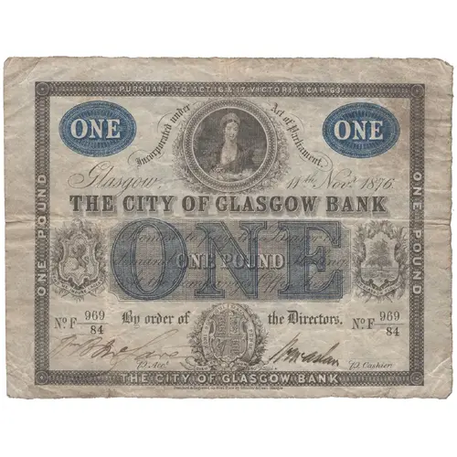 | Obverse lettering | Incorporated under Act of Parliament Glasgow, 15th May 1871 THE CITY OF GLASGOW BANK Promise to pay the Bearer on demand ONE POUND Sterling At the Company`s Office here By order of the Directors |