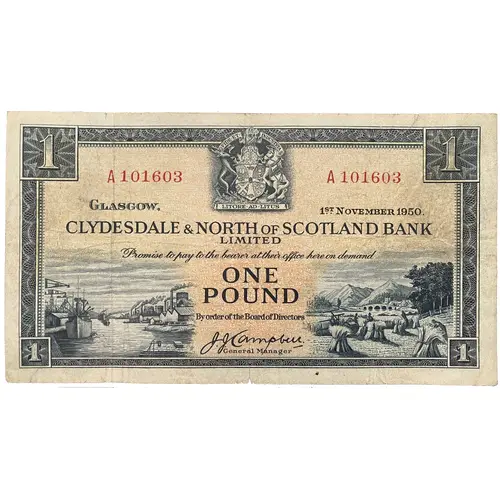 Fide et Industria Litore ad Litus Clydesdale & North of Scotland Bank Limited Promise to pay the bearer at their office here on demand One Pound By order of the Board of Directors (Translation: Faith and Diligence From coast to coast) |