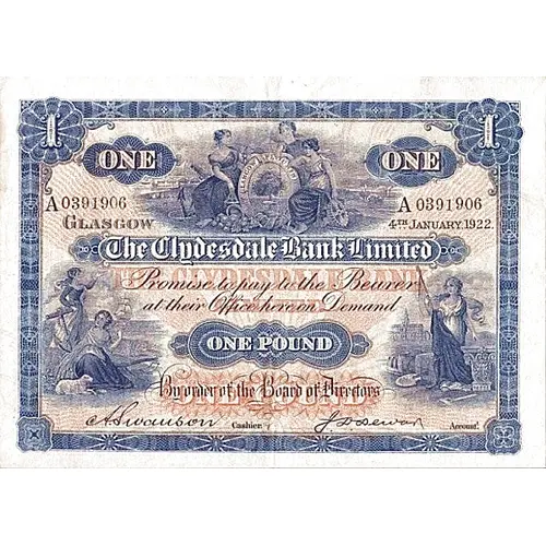 | Opschrift voorzijde | Glasgow The Clydesdale Bank Limited Promise to pay to the Bearer at their Office here on Demand One Pound By order of the Board of Directors |