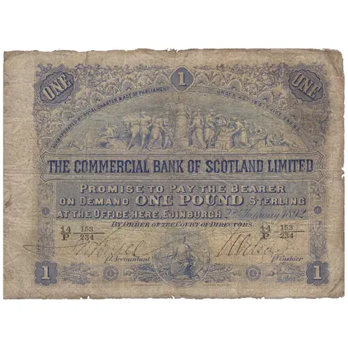 | Obverse lettering | The Commercial Bank of Scotland Limited Promise to pay the bearer on demand ONE POUND Sterling At the office here Edinburgh By order of the Court of Directors |