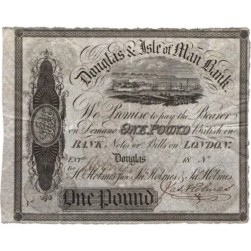 | Obverse lettering | DOUGLAS & ISLE OF MAN BANK. WE PROMISE TO PAY THE BEARER IN DEMAND ONE POUND BRITISH IN BANK. NOTES OR BILLS ON LONDON. DOUGLAS ONE POUND |
