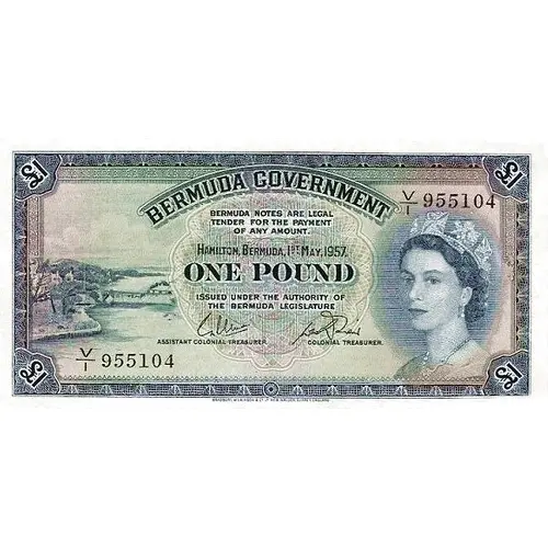 BERMUDA GOVERNMENT BERMUDA NOTES ARE LEGAL TENDER FOR THE PAYMENT OF ANY AMOUNT. HAMILTON, BERMUDA, 1st MAY, 1957. ONE POUND ISSUED UNDER THE AUTHORITY OF THE BERMUDA LEGISLATURE ASSISTENT COLONIAL TREASURER COLONIAL TREASURER BRADBURY WILKINSON & Co. Ld. NEW MALDEN, SURREY, LONDON ₤1 |