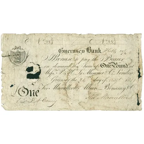 | Obverse lettering | Guernsey Bank Promise to pay the Bearer on demand the sum of One Pound here or at Mess, P.H. Le Mesurier & Co. London. Guernsey the day of April 18 For Macculoch, Maire, Bonamy & Co. |