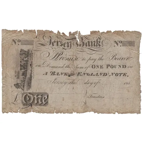 Obverse lettering Jersey Bank Promise to pay the Bearer on Demand the sum of ONE POUND in A BANK OF ENGLAND NOTE, Jersey the _ day of _ 181_ ONE _ Trustees _