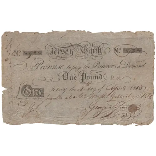 | Obverse lettering | Jersey Bank Promise to pay the Bearer on demand ONE POUND £ONE Jersey the 4th day of April 1815 payable at W. Math(?) Gallichan & Co. George Syvret |