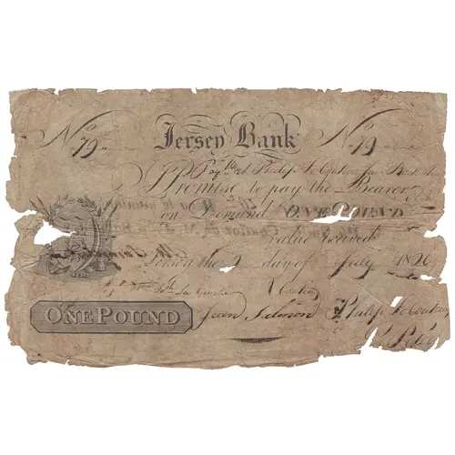 | Obverse lettering | Jersey Bank Promise to pay the Bearer on Demand ONE POUND value received. Jersey the 2 day of July 1820 ONE POUND |