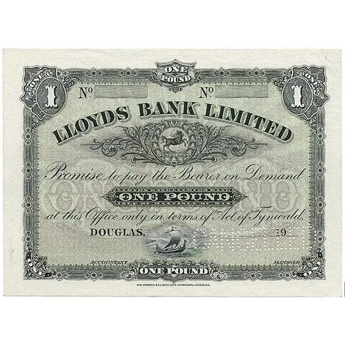 | Obverse lettering | ONE POUND LLOYDS BANK LIMITED Promise to pay the Bearer on Demand ONE POUND ar this Office only in terms of act of Tynwald DOUGAS ONE POUND |