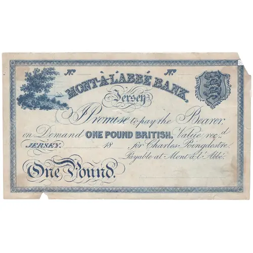 | Obverse lettering | MONT-À-L`ABBÉ BANK, Jersey I Promise to pay the Bearer, on Demand ONE POUND BRITISH, Value rec.d JERSEY._ 18_ for Charles Poingdestre. Payable at Mont-à-L`Abbé. One Pound. |