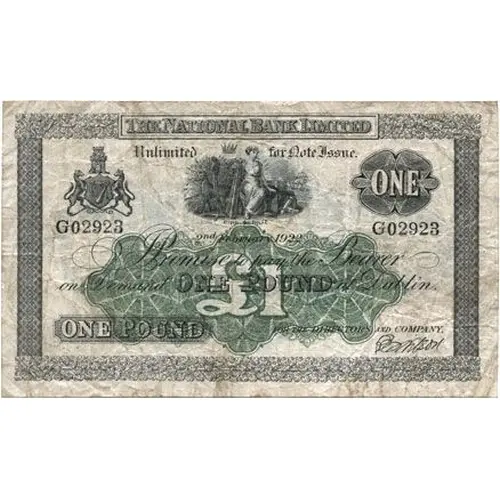| Obverse lettering | The National Bank Limited Unlimited for Note Issue I Promise to pay the Bearer on Demand One Pound at Dublin For the Directors and Company |