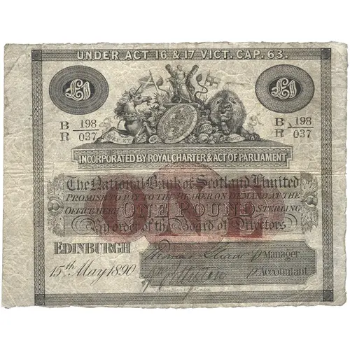| Obverse lettering | The National Bank of Scotland Limited Promise to pay the Bearer on demand at the office here ONE POUND Sterling By order of the Board of Directors Edinburgh |