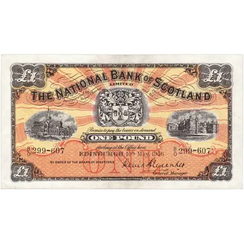 The National Bank of Scotland Limited Incorporated by Royal Charter and Act of Parliament Promise to pay the bearer on demand One Pound sterling at the Office here Edinburgh By order of the Board of Directors |