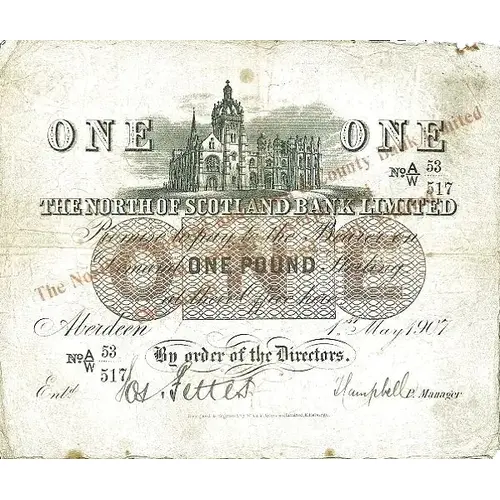 | Opis líce | THE NORTH OF SCOTLAND BANK LIMITED Promise to pay to the Bearer on Demand ONE POUND Sterling at their Office here Aberdeen By order of the Directors The North of Scotland & Town & County Bank Limited |