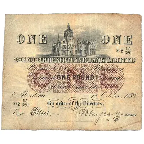 | Obverse lettering | THE NORTH OF SCOTLAND BANK LIMITED Promise to pay to the Bearer on Demand ONE POUND Sterling at their Office here Aberdeen By order of the Directors |