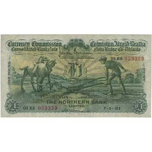 | Chữ khắc mặt trước | Currency Commission Consolidated Bank Note Coimisiún Airgid Reatha Nóta Bainc Có-Dhlúite One Pound Punt Payable at the Principle Office in Dublin of Tá so iníoctha ag an bPríomh-Oifig i mBaile Átha Cliath de The Northern Bank Limited |