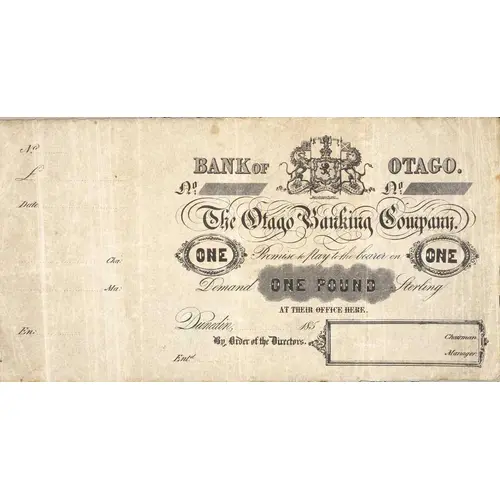 BANK OF OTAGO THE OTAGO BANKING COMPANY ONE ONE PROMISE TO PAY THE BEARER IN DEMAND ONE POUND STERLING AT THEIR OFFICE HERE DUNEDIN BY ORDER OF THE DIRECTORS |