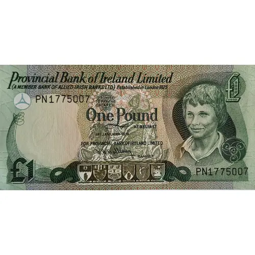 | Obverse lettering | Provincial Bank of Ireland Limited (A member of Allied Irish Banks Ltd) Established London 1825 Promise to pay the bearer One Pound at Belfast |