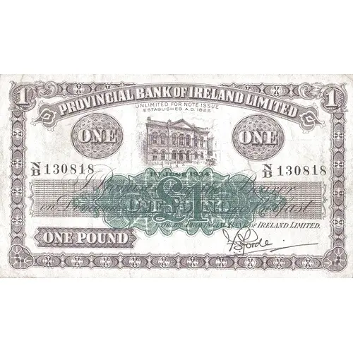 Provincial Bank of Ireland Limited Unlimited for Note Issue Established A.D. 1825 I Promise to pay the Bearer on demand One Pound at Belfast |