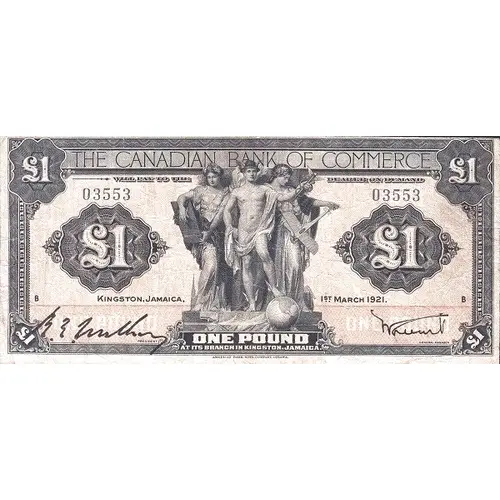 | Obverse lettering | THE CANADIAN BANK OF COMMERCE WILL PAY TO THE BEARER ON DEMAND KINGSTON JAMAICA ONE POUND AT ITS BRANCH IN KNIGSTON JAMAICA PRESIDENT GENERAL MANAGER AMERICAN BANK NOTE COMPANY OTTAWA |