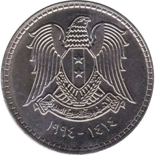 | Obverse lettering | الجمهورية العربية اسورية ١٤١٤ - ١٩٩٤ (Translation: Syrian Arab Republic 1994 - 1414) |