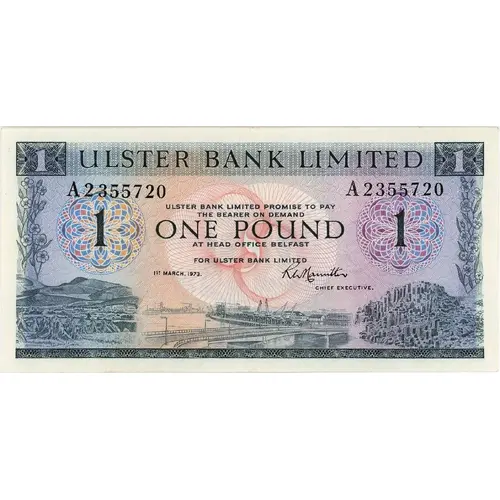 ULSTER BANK LIMITED ULSTER BANK LIMITED PROMISE TO PAY THE BEARER ON DEMAND ONE POUND AT HEAD OFFICE BELFAST FOR ULSTER BANK LIMITED |