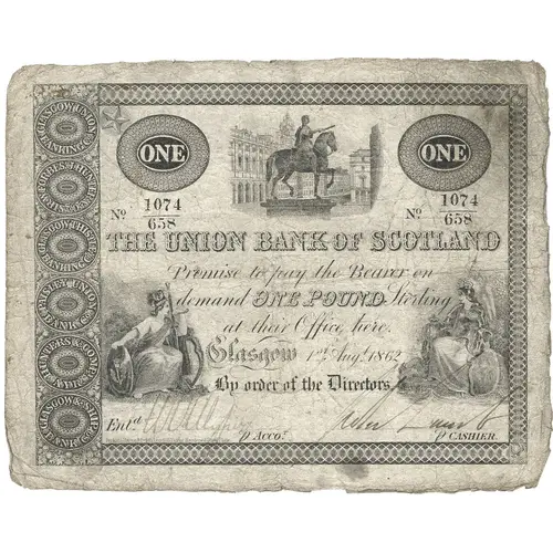 | Obverse lettering | The Union Bank of Scotland Promise to pay the Bearer on demand ONE POUND Sterling at their office here Glasgow By order of the Directors |