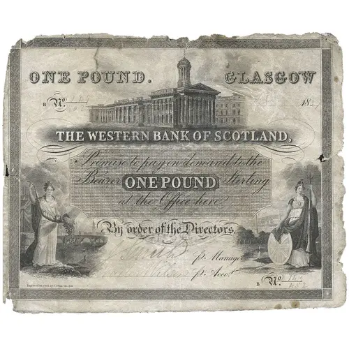 | Obverse lettering | ONE POUND. GLASGOW THE WESTERN BANK OF SCOTLAND Promise to pay on demand to the Bearer ONE POUND Sterling at the Office here By order of the Directors. |