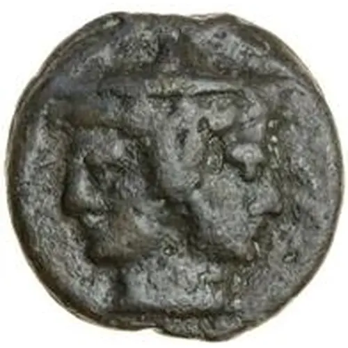 Descripción del anverso Janiform head of Culsan wearing petasos.