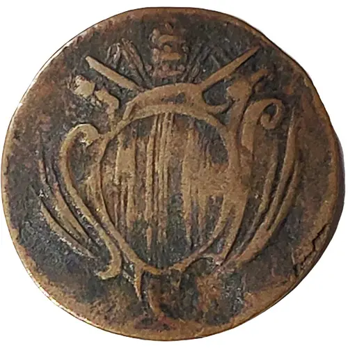 | Reverse description | Saint Apollinaris standing facing, head left, long cross in left hand, right hand open downward toward church |