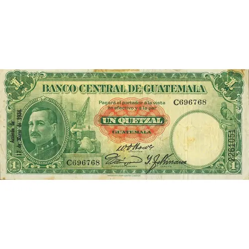 | Obverse lettering | Banco Central de Guatemala Pagara al portador á la vista, en efectivo y á la par UN QUETZAL GUATEMALA Acuerdo de 17 de Marzo de 1934. (Translation: Central Bank of Guatemala Pay the bearer in cash at sight and at par One Quetzal Guatemala According March 17th., 1934.) |