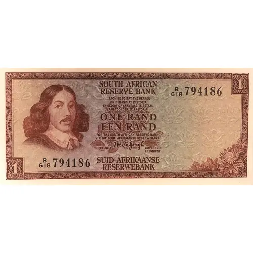 SOUTH AFRICAN RESERVE BANK 1 I promise to pay the bearer on demand at Pretoria Ek beloof op aanvraag te betaal aan toonder te Pretoria ONE RAND EEN RAND For the south african reserve band Vir die Suid-Afrikaanse Reserwebank PRETORIA T.W. Dejongh Governor. President. 1 SUID-AFRIKAANSE RESERWEBANK |