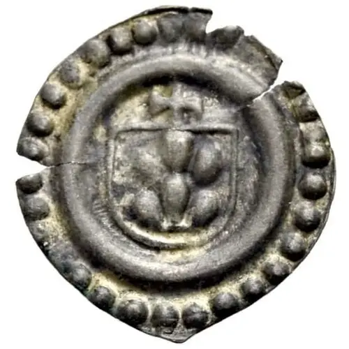 | Beschrijving voorzijde | City arms, cross above, in circle of pellets. |