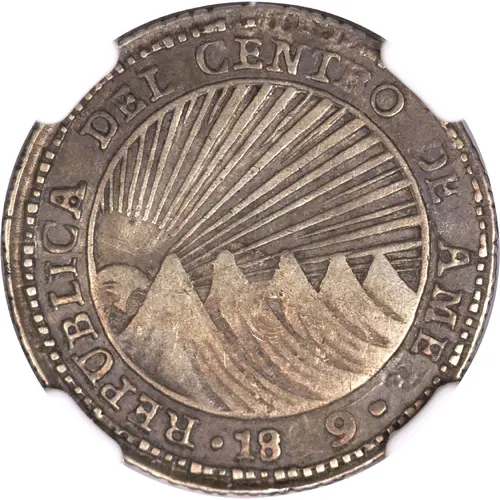 | Obverse description | Radiant sun with face, behind row of five volcanoes. With legend around and date at bottom. |