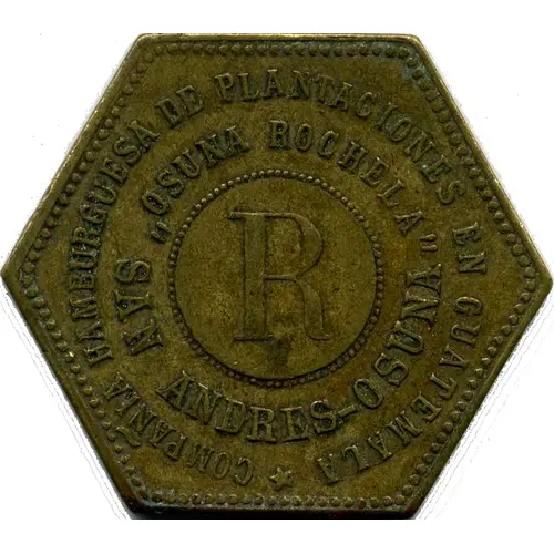 | Obverse lettering | *COMPAÑÍA HAMBURGUESA DE PLANTACIONES EN GUATEMALA `OSUNA ROCHELA` SAN ANDRES- OSUNA (Translation: Hamburg plantation company in Guatemala OSUNA ROCHELA San Andres - Osuna) |