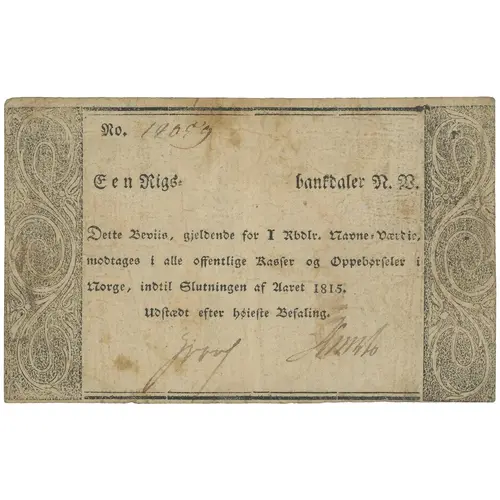 No. Een Rigs= bankdaler R. B. Dette Beviis, gjeldende for I Rbdlr. Navne = Værdie, Modtages i alle offentlige Kasſer og Oppebørſeler i Norge, indtil Slutningen af Aaret 1815. Udſtædt efter høieſte Befaling. |