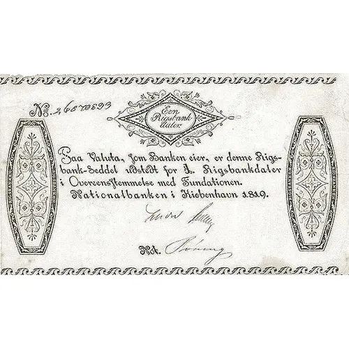 | Obverse lettering | Een Rigsbank- daler Paa Valuta, som Banken eier, er denne Rigs- bank-Seddel udstedt for 1 Rigsbankdaler i Overenstemmelse med Fundationen. Nationalbanken i Kiøbenhavn 1819 |
