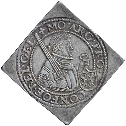 | Descripción del anverso | Armored and laureate half bust, holding sword in his right hand against his shoulder and shield with arms of Gelderland with left hand, within dotted inner circle. |