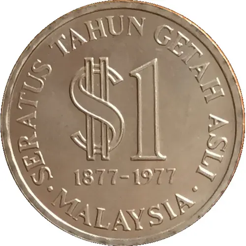 The face value of $ 1 is surrounded by the words `ONE HUNDRED YEARS OF NATURAL RUBBER` side of the coin with `1877-1977` below the denomination. The word `Malaysia` minted coins at the bottom. |