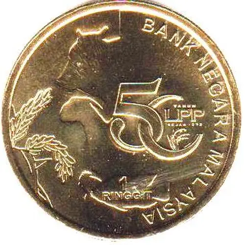 | Описание аверса | The right circumference of the coin features the text `BANK NEGARA MALAYSIA` to depict the issuing authority. The logo for LPP’s 50th anniversary is shown at the centre of the coin against the silhouette of various livestock. The text `1 RINGGIT` is shown at the bottom of the coin, representing its face value. |