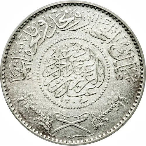 | Reverse lettering | ريال عربي سعودي واحد ضرب في مكة المكرمة ١٣٤٦ ١ (Translation: One Saudi-Arabian Riyal Minted in the Holy City of Mecca 1346 1) |