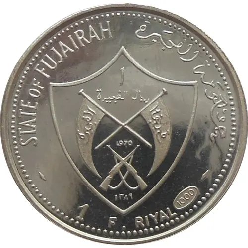| نوشتههای روی سکه | STATE OF FUJAIRAH حُكومَة الفجَيرة ١ ريال الفجيرة الفجيرة الفجيرة 1970 ١٣٨٩ - 1 F . RIYAL [1000] - (Translation: State of Fujairah 1 Fujairah Riyal Fujairah 1970 1389 1 F. Riyal [1000]) |