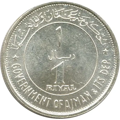 | Opschrift voorzijde | ★ حُكُومَة عَجمَان وَتوابعهَا ★ ١ ريال 1 RIYAL GOVERNMENT OF AJMAN & ITS DEP. (Translation: Government of Ajman and its dependencies 1 Riyal) |
