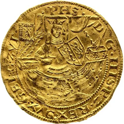 Regal figure on ship, facing, holding sword with right hand and shield with Gelderland arms in left; on stern, banner with rampant lion left; large rose on ship`s hull. |