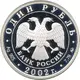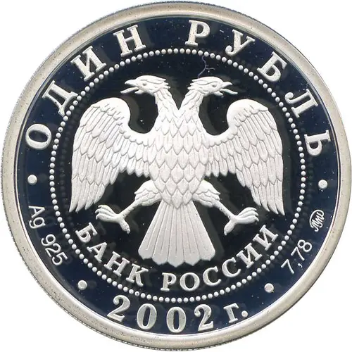 | Obverse lettering | ОДИН РУБЛЬ БАНК РОССИИ • Ag 925 • 2002 г. • 7,78 ММД • (Translation: One Rouble Bank of Russia MMD) |
