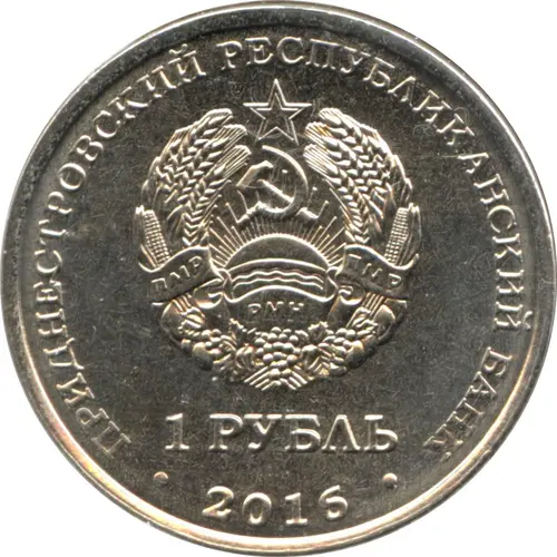 | Obverse description | In the centre - the State Emblem of the Transnistrian Moldovan Republic; along the rim - the inscription: at the top - «ПРИДНЕСТРОВСКИЙ РЕСПУБЛИКАНСКИЙ БАНК» (Transnistrian Republican Bank), at the bottom - the Year of issue `2016`; at the bottom under the arms - the denomination «1 РУБЛЬ» (1 rouble). |
