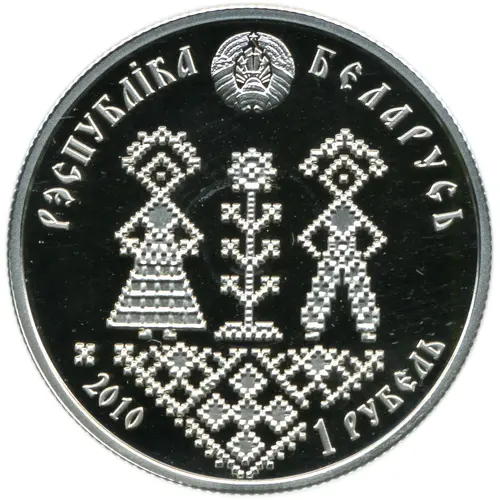 At the top – the relief image of the State Coat of Arms of the Republic of Belarus; in the center – the image of ancient Slavic symbols of virgin and youthful virtues – deities Lada and Lel, standing on the basis of a triangular decorative composition including the symbols of life, family, and the Sun; beneath – the year of issue and the denomination: 1 РУБЕЛЬ (1 RUBLE); at the top – a circumferential inscription: РЭСПУБЛІКА БЕЛАРУСЬ (THE REPUBLIC OF BELARUS). |